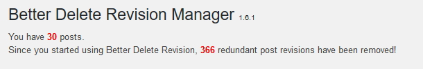 Since you started using Better Delete Revision, 366 redundant post revisions have been removed!