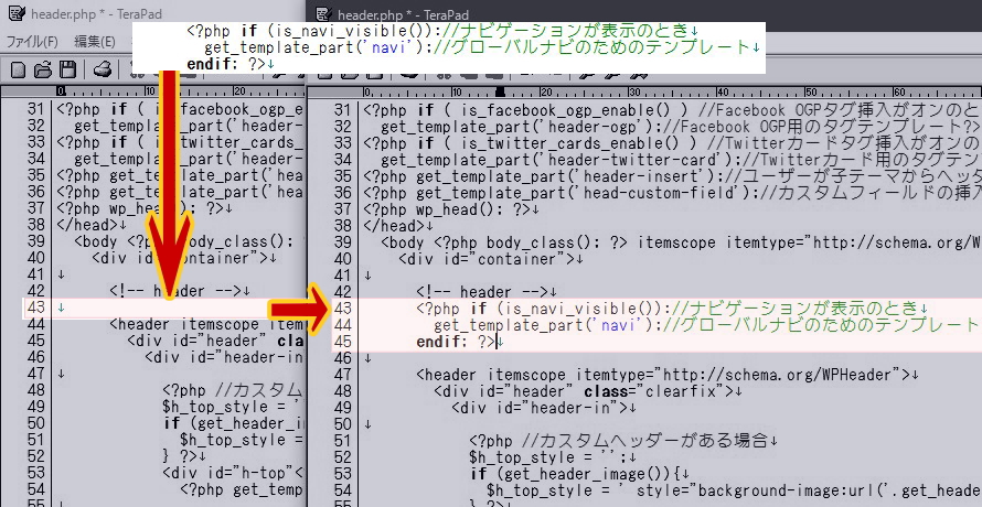<div id=”container”><!– header –>はTeraPadで40~42行目にあります。